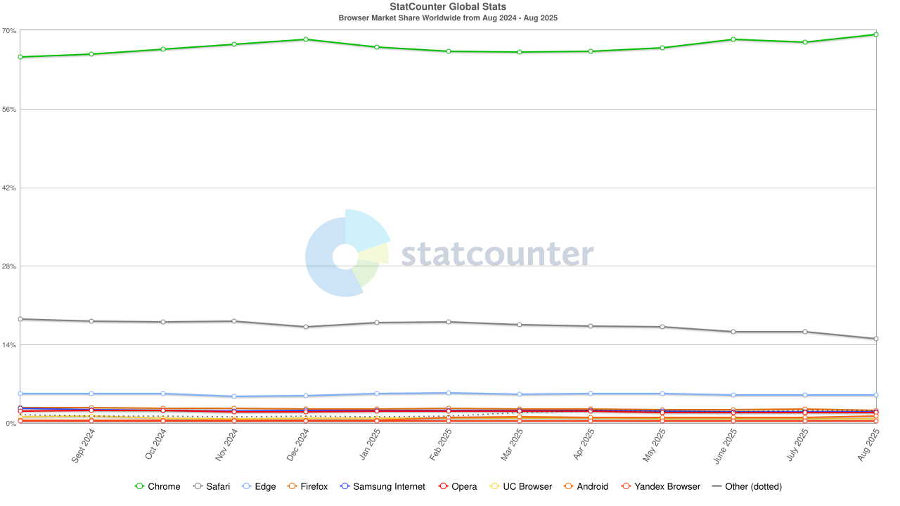 아마도 대부분 비슷하게 답하실 것 같은데요, 최근 전 세계 시장 점유율도 비슷한 답을 주고 있거든요. 크롬이 69%로 절대적인 1위를 차지하고 있고, 이어서 사파리가 15%로 2위입니다. MS의 엣지(5%), 파이어폭스(2%) 등이 뒤를 잇고요.