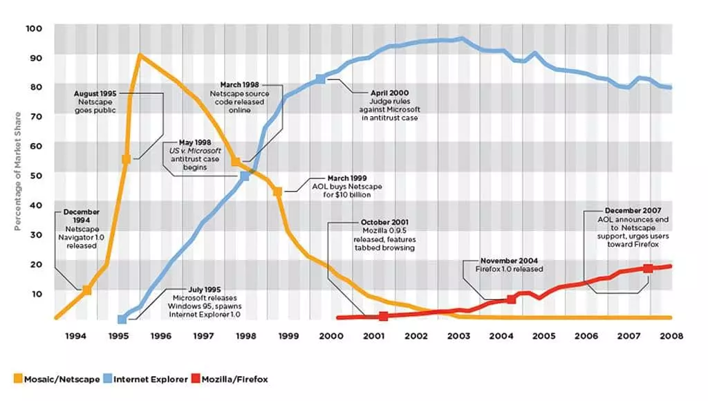 인터넷 익스플로러가 브라우저 시장을 독점한 후, MS는 익스플로러의 추가적인 개발을 중단하다시피 했습니다. 그렇게 방치되는 동안, 업데이트 주기도 늦어졌을 뿐 아니라 새로운 웹 표준을 따라잡지도 못하게 되면서 최신 웹사이트와 호환성이 떨어졌습니다. ActiveX와 같은 비표준 기술 때문에 보안적인 문제도 많았고요. 사용자들은 느리고 불편하며 불안한 IE를 대신할 대체 브라우저를 찾기 시작했습니다. (원래 기본적인 것들은 불편해지기 시작할 때부터 존재감이 커지기 마련이니까요.)