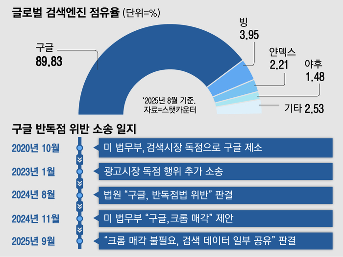 바로 이런 점에서 미국 법무부는 지난 11월, 검색 시장에서의 불법적인 독점 지위를 해소하기 위해 구글에 크롬을 매각할 것을 제안했습니다. 구글은 작년 8월, 미 법무부가 제소한 검색시장 반독점 소송에서 유죄를 선고받았습니다. 이미 전 세계 검색엔진 점유율의 90%를 차지하고 있는데, 이 지위를 유지하기 위해 애플, 모질라, 삼성전자 등과 체결한 ‘기본 검색 엔진’ 계약 등을 통해 시장 지배력을 불법적으로 남용하고 경쟁을 제한했다는 것입니다.
