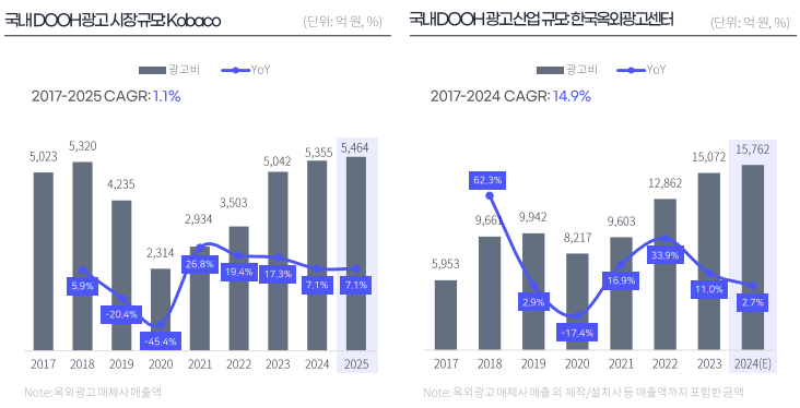국내 DOOH 시장은 팬데믹 이후 꾸준히 성장세입니다. 한국방송광고진흥공사(KOBACO) 조사에 따르면, 2025년 우리나라의 DOOH 광고 시장 규모는 5,464억 원 규모라고 하는데요. 팬데믹 때 크게 위축되었던 시장이 다시 빠르게 회복하면서, 전례 없이 어려운 광고 시장 속에서도 DOOH는 플러스 성장을 이어가며 두각을 보이고 있어요. |