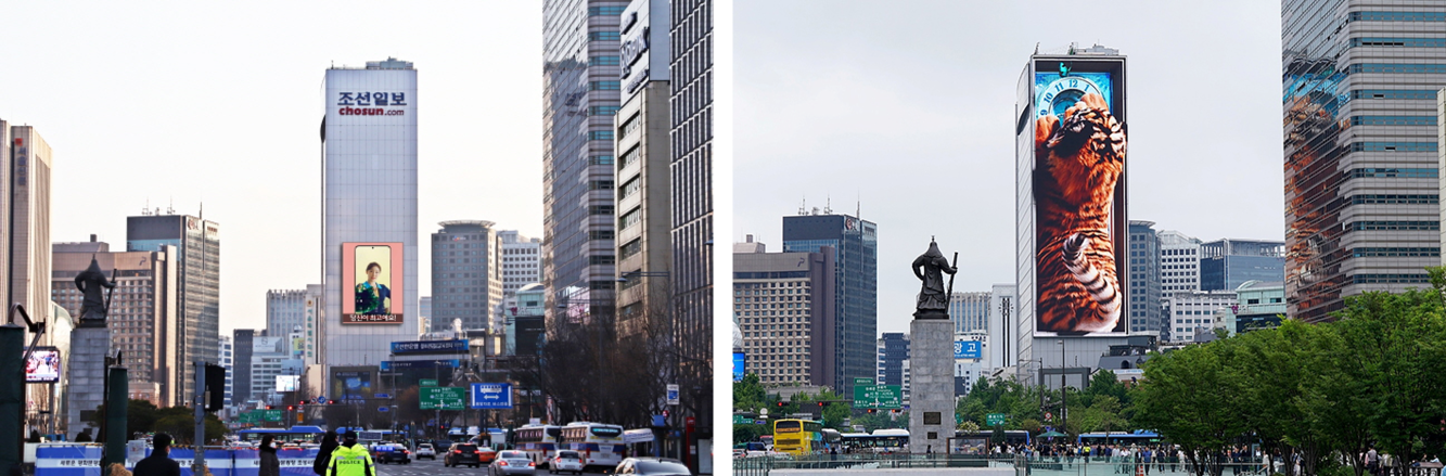 여러분, 최근에 서울 광화문 광장에 가보신 적 있나요? 가을이라 노랗게 물든 은행나무를 보러 지난 주말 서촌이나 북촌 데이트를 다녀오신 분도 많을 것 같아요. 고즈넉한 경복궁 안을 거닐다가 광화문을 지나면서 시야에 들어오는 도심의 풍경이 때로는 이질적으로 느껴지기도 하는데요. 요즘 들어서는 도심에 세워진 빌딩들이 만드는 스카이라인에 눈이 가기보다는, 각각의 빌딩에 설치된 초대형 전광판들에 먼저 눈길이 가더라고요.