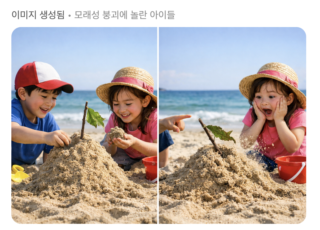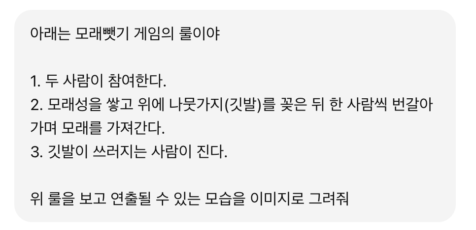 아주 단순하게 ‘모래 뺏기’ 게임이라고 예를 들어볼게요. AI에게 게임의 룰과 세트장의 분위기, 게임 참여 인원을 명시한 후에 그 장면을 그려오라고 합니다. 이렇게 하면 게임에 참여하는 출연진들의 구도와 전체적인 풍경을 직관적으로 보여줄 수 있죠. 한 두 사람이 이렇게 AI로 이미지를 만들어 회의에 가져오기 시작하니 모두가 아이디어를 가져올 때마다 꼭꼭 AI로 이미지를 만들어오게 되었습니다. |