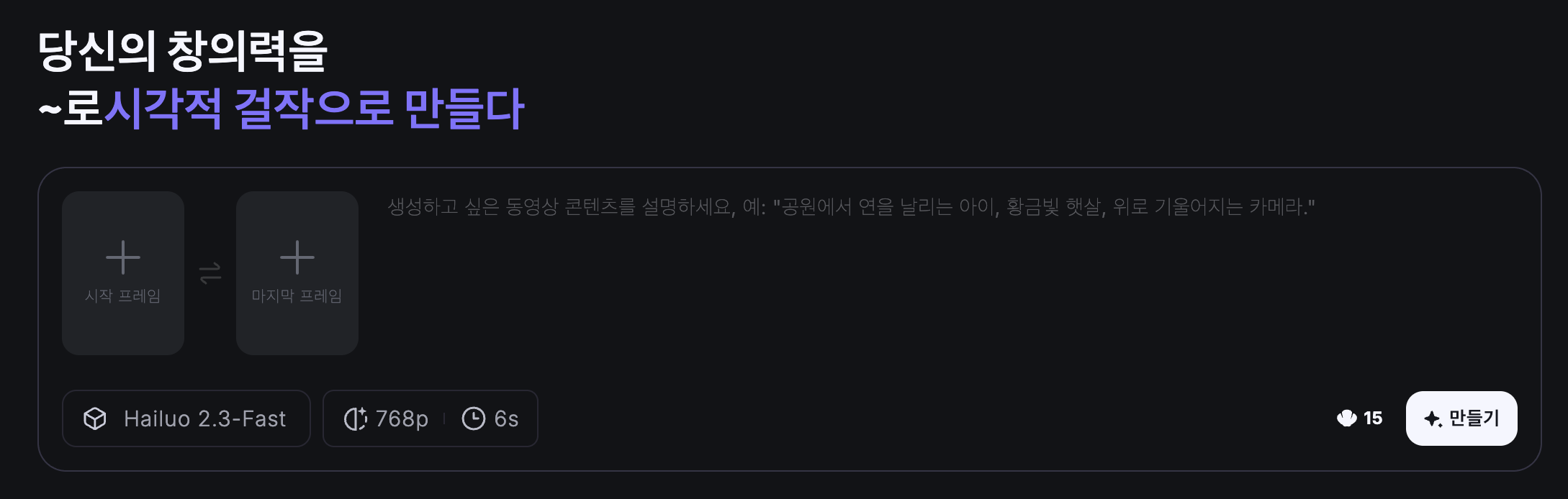 첫 프레임과 끝 프레임을 잡아 프롬프트를 입력하는 창 © Hailuo AI 화면 캡쳐 |
