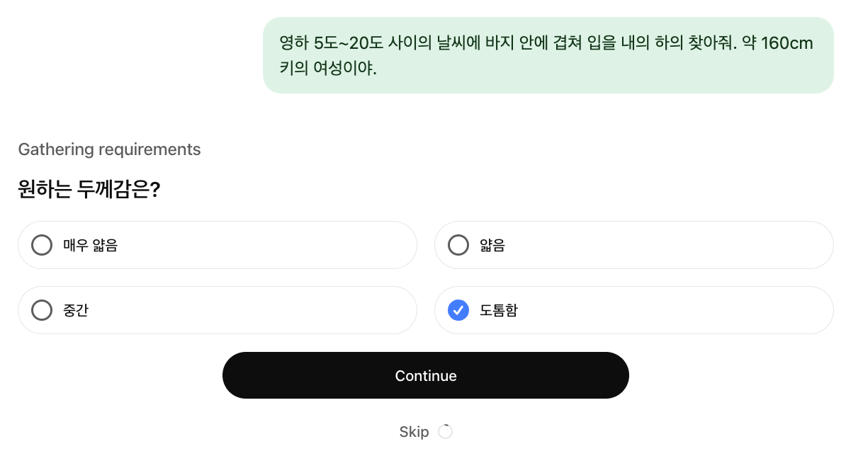 - 몇 가지 조건을 제시하는 질의만으로도 사람들이 이 제품을 구매할 때 어떤 요소를 주로 비교하는지 인식해 질문을 던집니다. 예를 들어, 추운 날씨에 입을 내의를 찾아달라고 했더니 두께감과 촉감의 선호도를 묻습니다.