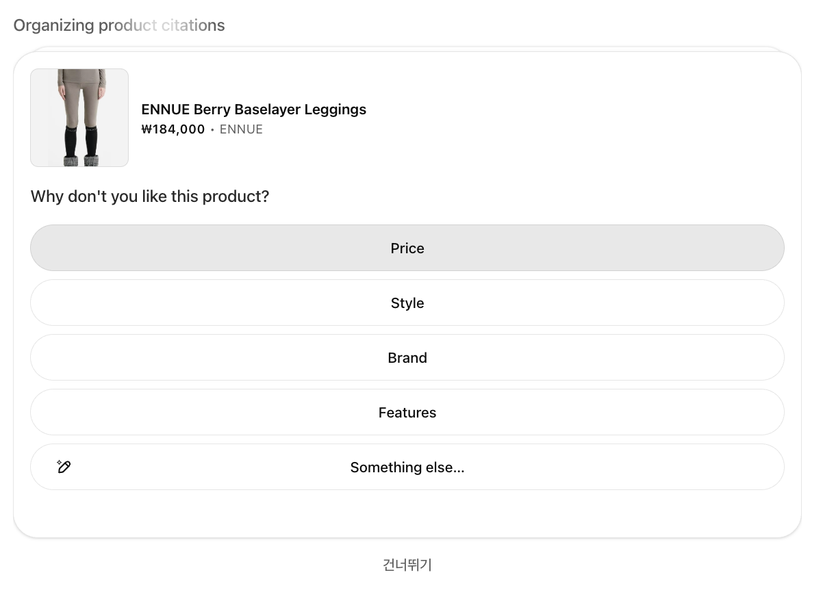 - 추가로 3~4개 추천 후보를 선제적으로 제시해 사용자의 긍정·부정 평가와 그 이유를 수집하고, 대화 상호작용 속에서 추가 선호를 파악해 추천을 고도화합니다. 이미지, 판매 플랫폼, 가격, 스타일을 통해 더 세밀한 정보를 얻습니다.