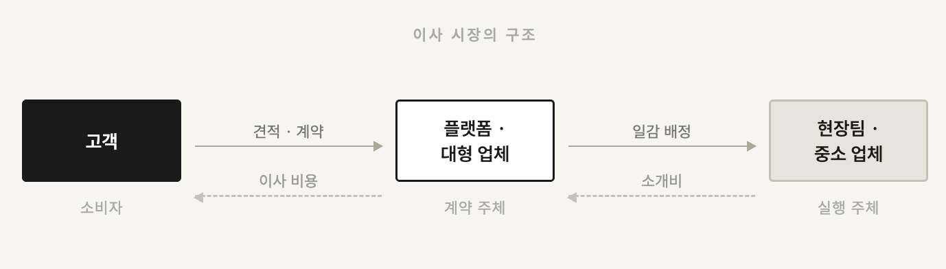 둘째, 계약 주체와 실행 주체가 분리되어 있습니다. 소비자는 플랫폼이나 본사를 통해 계약하지만 실제 이사 당일 방문하는 것은 별도의 현장 팀입니다. 계약서에 적힌 금액은 플랫폼과의 약속이고, 현장 팀의 수익은 그 금액에서 소개비를 제하고 남은 몫입니다. 추가금은 바로 이 간극에서 생겨납니다. 현장 팀은 “짐이 많다”, “사람을 더 불러야 할 것 같다”라는 식으로 자신들의 몫을 늘리려 하고, 플랫폼은 그 순간 책임에서 한발 물러나 있죠. |