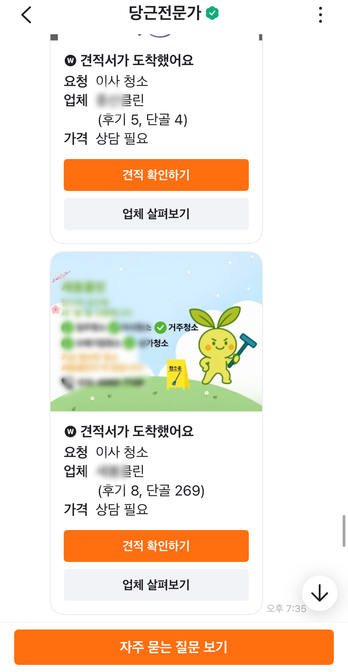 이번 이사를 준비하면서 당근마켓과 오늘의 집을 통해 이사/청소 업체에 견적을 요청했습니다. 여러 업체에서 답장이 왔는데, 가격란에 적힌 내용은 하나같이 '상담 필요'였습니다. 하루에만 열 통이 넘게 모르는 번호로부터 계속 전화가 왔습니다. 제가 원하는 건 대략적인 가격을 알고 싶은 거였는데, 업체들은 일단 통화부터 하기를 원했죠. 업무 중에, 회의실에 있다가도 조용히 핸드폰을 들고나와 이사 타임라인은 어떻게 되는지, 짐이 얼마나 되는지 같은 이야기를 새로운 업체와 통화할 때마다 반복해서 이야기하는 게 굉장히 피곤한 일이었습니다.